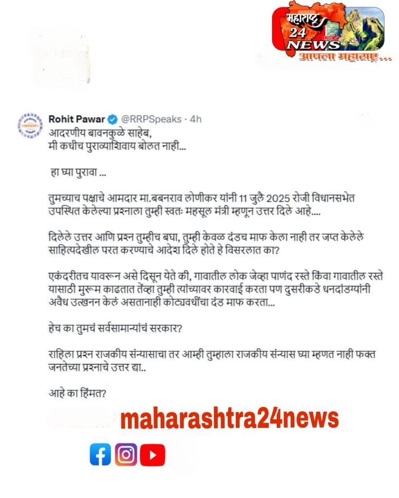 रोहीत पवार : “मी कधीच पुराव्याशिवाय बोलत नाही…हा घ्या पुरावा …” असे म्हणत भाजपचे आमदार बबनराव लोणीकर यांनी 11 जुलै 2025 रोजी विधानसभेत उपस्थित केलेल्या प्रश्नाला महसूल मंत्री बावनकुळे यांनी दिलेल्या उत्तराचा दाखला थेट सोशल मीडियावर शेअर करीत बावनकुळेंची कोंडी केली आहे. ‘आम्ही तुम्हाला राजकीय संन्यास घ्या म्हणत नाही फक्त जनतेच्या प्रश्नाचे उत्तर द्या..आहे का हिंमत? असे सांगत रोहित पवारांनी बावनकुळेसमोर दंड थोपटले आहेत.