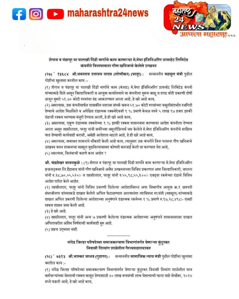 तुमच्याच पक्षाचे आमदार मा.बबनराव लोणीकर यांनी 11 जुलै 2025 रोजी विधानसभेत उपस्थित केलेल्या प्रश्नाला तुम्ही स्वतः महसूल मंत्री म्हणून उत्तर दिले आहे….