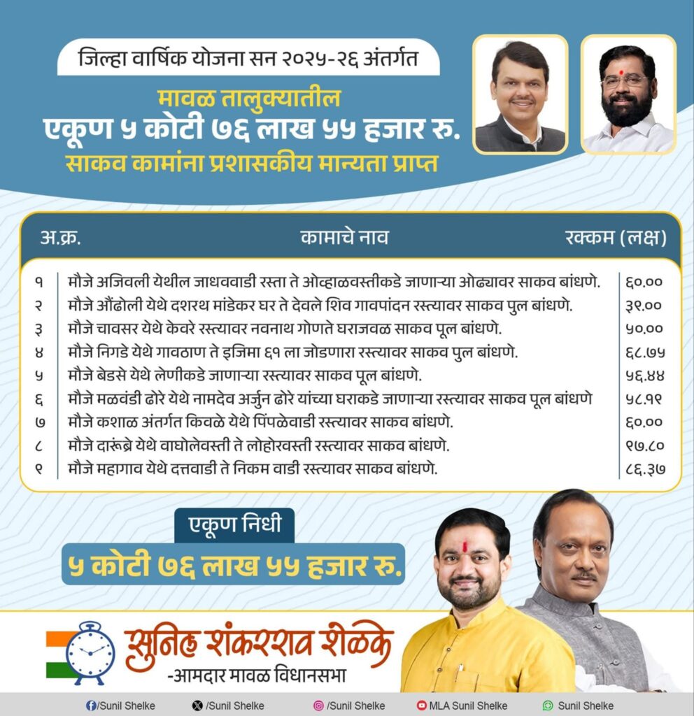 मावळ तालुक्यातील एकूण ५ कोटी ७६ लाख ५५ हजार रुपये इतक्या निधीतून साकव कामांना प्रशासकीय मान्यता प्राप्त.