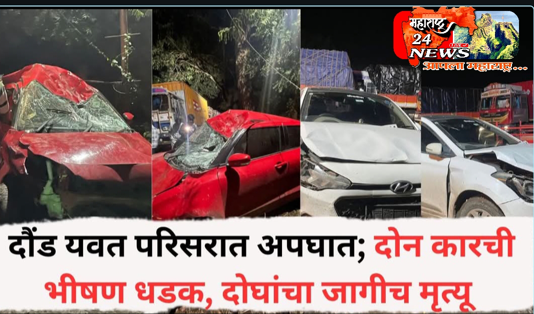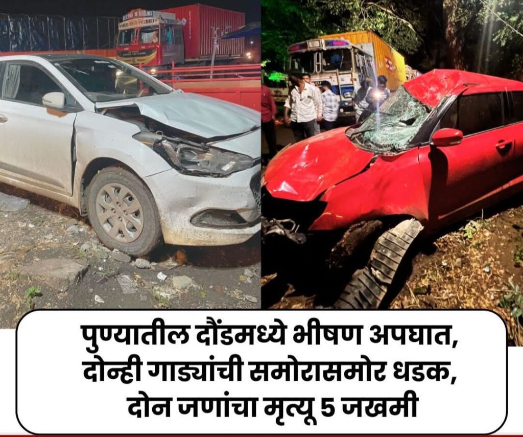 दौंड: पुणे सोलापूर राष्ट्रीय महामार्गावर यवत पोलिस स्टेशनच्या हद्दीत दोन कारची भीषण धडक झाली. काल (बुधवारी, ता 20) रात्री झालेल्या या भीषण अपघातात दोन तरुणांचा मृत्यू झाला आहे. तर 5 जण जखमी झाले आहेत. या अपघाताबाबत पोलिसांनी दिलेल्या माहितीनुसार, राकेश भोसले हा आपल्या लाल रंगाच्या स्विफ्ट कारने पुणे-सोलापूर महामार्गावरून निष्काळजीपणे व नियमांचे उल्लंघन करून वेगाने जात होता, यावेळी त्याने उरुळीकडे जात असणाऱ्या स्विफ्ट डिझायर या गाडीला समोरासमोर धडक दिली. या धडकेत ज्ञानेश्वर थोरबोले (वय 50, रा. उरुळी कांचन, ता. हवेली, जि. पुणे) व गणेश दोरगे (वय 28, रा. यवत, ता. दौंड, जि. पुणे) यांचा जागीच मृत्यू झाला.
